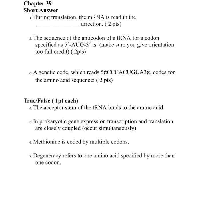 During translation the mRNA is read in the direction. Small summary of chapter 39.